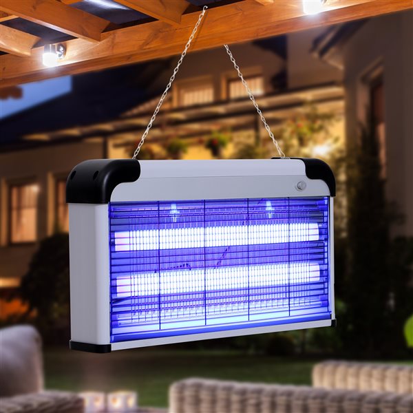 ¿Estás harto de los mosquitos? Te presentamos esta fantástica lámpara anti-moquistos con una rejilla electrificada la cual mantendrá los alimentos limpios y te protege de moscas y mosquitos en un rango de 60 m². Y todo esto, sin el uso de productos químicos o tóxicos: los mosquitos y las moscas son atraídos por la luz ultravioleta del dispositivo y luego mueren instantáneamente por la corriente que emite el dispositivo. Este dispositivo marca Outsunny te será igual de efectivo durante el día como por la noche, aunque haya otras luces artificiales encendidas, funciona igual. Apto para interiores y exteriores.