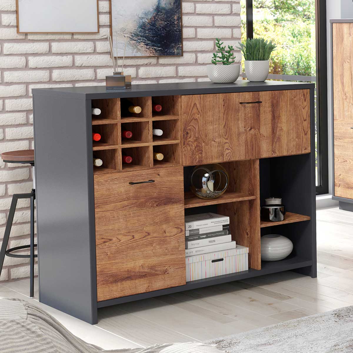 El aparador buffet Europa transformará tu sala de estar o comedor en un espacio elegante y organizado. Fabricado con melamina de alta calidad, este mueble no solo garantiza resistencia y durabilidad, sino que también aporta un toque rústico e industrial que lo hace destacar. Compuesto por 4 módulos huecos, el buffet Europa ofrece un amplio espacio para exhibir y organizar tus pertenencias de manera ordenada. Un botellero con capacidad para 9 botellas proporciona una solución inteligente para almacenar tus vinos favoritos, mientras que la puerta y el cajón ofrecen espacio adicional para guardar artículos más pequeños y delicados. La repisa superior añade un toque adicional para exhibir objetos decorativos o para utilizarse como un minibar. Fácil de montar y fácil de limpiar, el buffet Europa no te supondrá un gran esfuerzo en cuanto a su mantenimiento. Su diseño polivalente hace que este aparador sea ideal tanto para la sala de estar como para el comedor. ¡No esperes más y hazte con este mueble Europa, ahora a un precio de chollo!