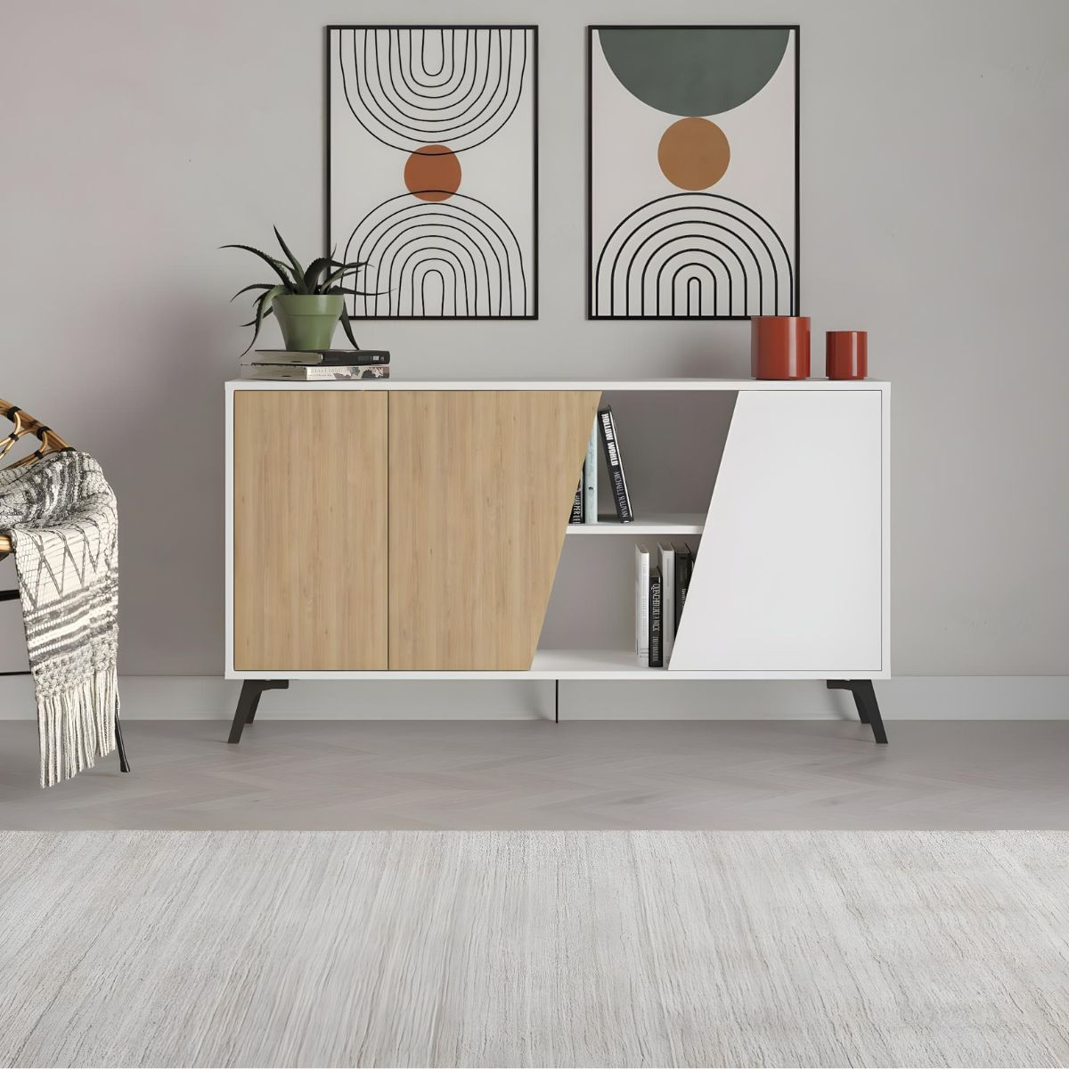 Aparador modelo Fiona de 150 cm en blanco y roble es una pieza elegante y funcional que encajará perfectamente en cualquier estancia del hogar. Su diseño eficiente combina una estructura de melamina de 18 mm en armazón y frentes con fondos y traseras de 8 mm, ofreciendo una gran resistencia y estabilidad. La base metálica en negro mate, junto con sus cinco patas, aporta firmeza y un toque moderno.