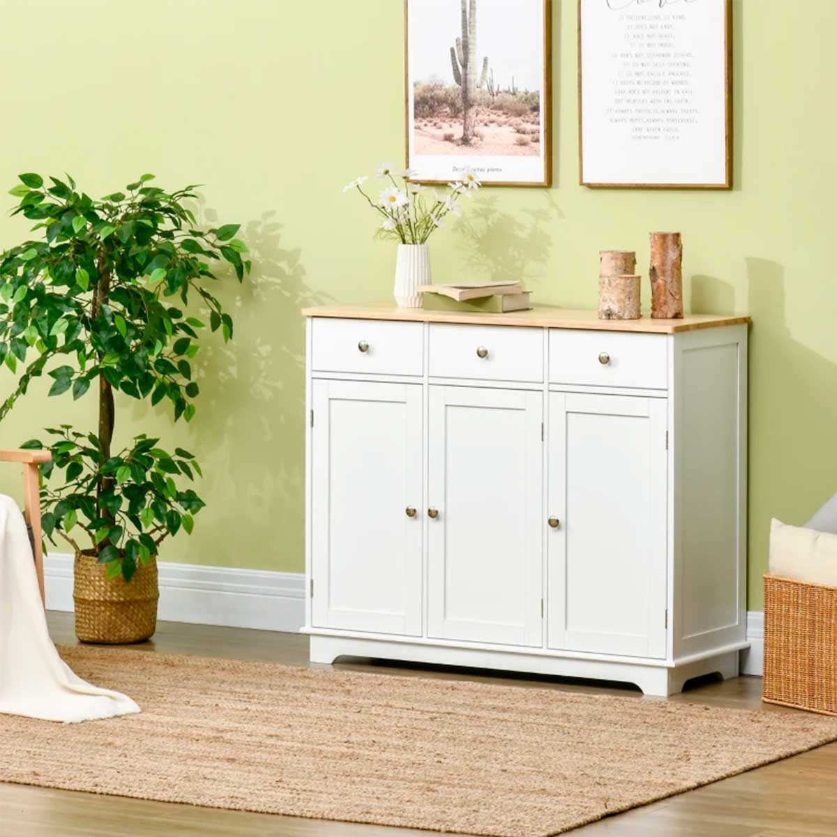 ¿Buscas ampliar el espacio de almacenaje de tu cocina, salón o comedor? Este precioso aparador Forest te da la solución con sus 3 cajones y 3 amplios armarios, te ofrece el plus de espacio que necesitas. Los armarios cuentan con baldas interiores que son ajustables en altura para adaptarse a tus necesidades y que puedas almacenar desde platos hasta fuentes de mayor tamaño o cualquier objeto que necesites organizar. Este aparador es de lo más versátil gracias a sus colores y diseño compacto, combinará a la perfección con cualquier mueble y colores. Fabricado en melamina de más alta calidad, será resistente al paso del tiempo y duradero al uso del día a día. Además, su sistema antivuelco evitará caídas y vuelcos del mueble protegiendo a los más pequeños de la casa. ¡Hazte con tu aparador Forest ya!