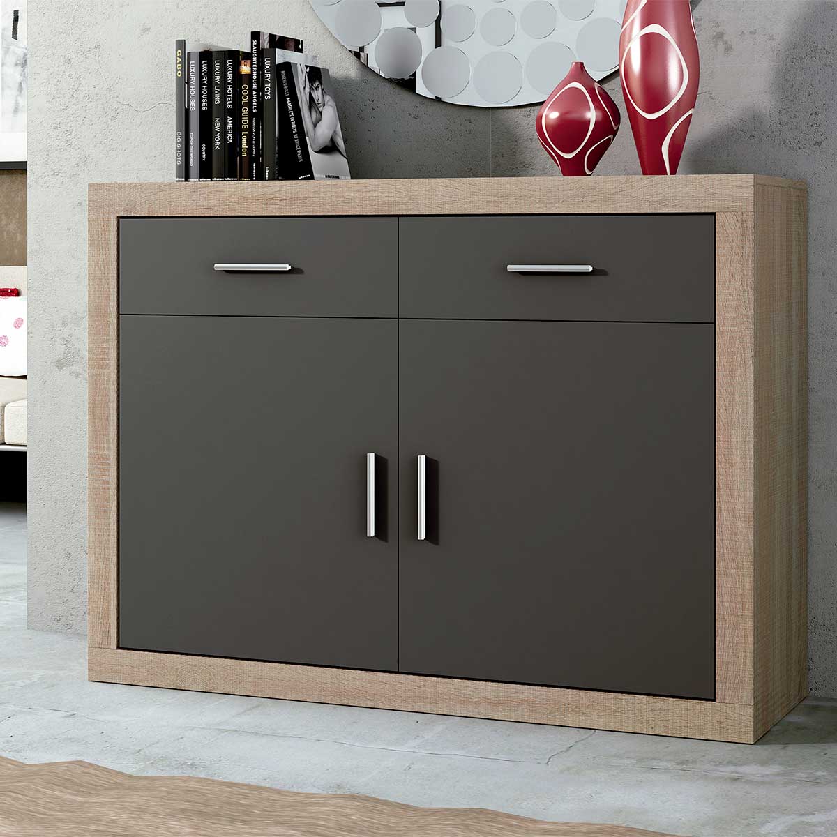 ¡Despídete del desorden con este práctico aparador modelo Lara! Con sus 2 cajones y sus 2 puertas podrás guardar cómodamente una gran cantidad de objetos para hacer más fácil tu día a día. El mueble está fabricado en melamina de buena calidad. Ideal para colocarlo en salas de estar y salones, se trata de un mueble muy polivalente y resistente que te acompañará durante muchos años. Consíguelo a un precio a lo bestia en Embargosalobestia.