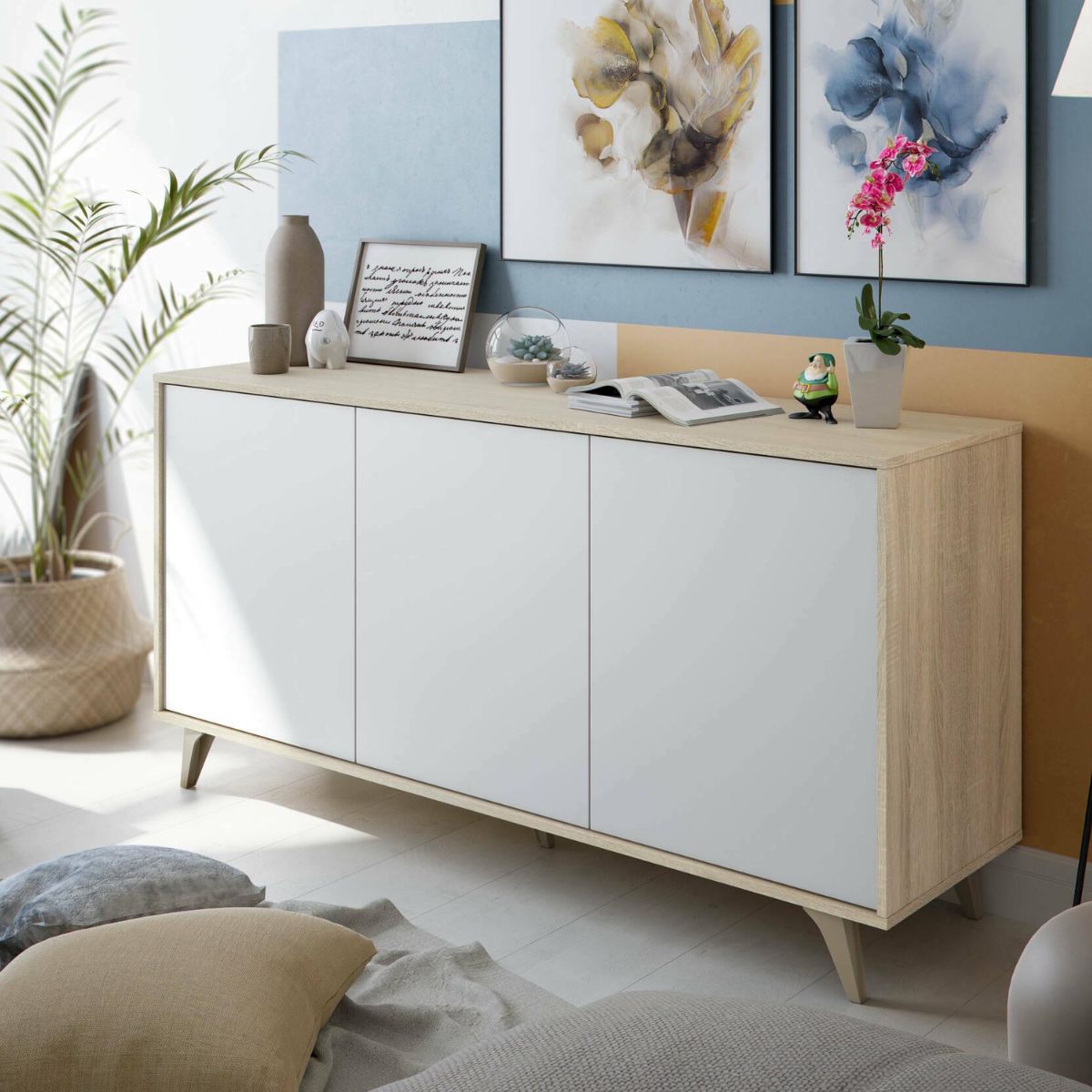 El aparador Relax Plus viene acabado en color roble canadian y blanco artik (mate), dos colores que combinados darán a tu salón un toque moderno y elegante que te sorprenderá. En su estructura, dispone de tres puertas con estantes interiores, las cuales se abren mediante sistema "push", permitiéndote abrirlo de manera fácil y sencilla. Fabricado en melamina de alta calidad, este aparador te ayudará a mejorar el orden de tu salón, ofreciéndote una buena capacidad de almacenaje.