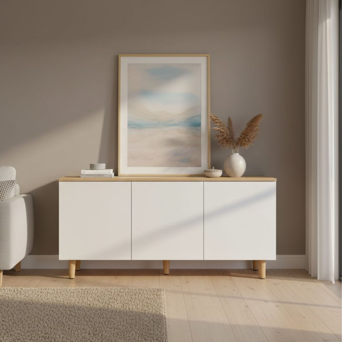 El tablero superior es espacioso y te permite colocar decoración, plantas, lámparas o incluso usarlo como apoyo extra en el día a día, ganando funcionalidad sin renunciar al estilo. Las patas elevadas no solo aportan un look más ligero y contemporáneo, sino que facilitan la limpieza y mantienen el mueble bien estable. Space es ese aparador que encaja sin pedir permiso, práctico, moderno y con una presencia que suma valor y organización a tu hogar sin complicarte la vida.