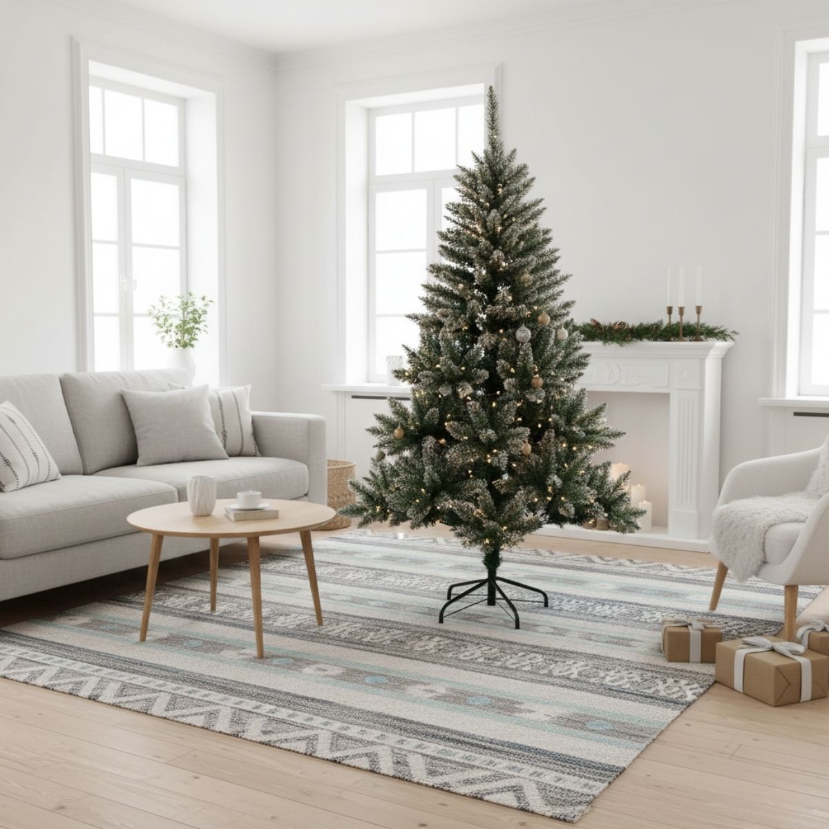 Dale a tu hogar la calidez de un paisaje invernal con nuestro árbol de Navidad con efecto nevado. Con una altura de 150 cm, este árbol es la pieza central perfecta para crear un ambiente acogedor y festivo. Su diseño combina el clásico color verde de un pino natural con la magia de las puntas cubiertas de nieve artificial, aportando un toque de realismo y encanto a tu decoración. Con 420 ramas densas, el árbol ofrece una silueta exuberante y voluminosa, ideal para colgar tus adornos favoritos y luces. Fabricado con materiales de alta calidad, como el PVC y el metal, este árbol es resistente y duradero, lo que te permitirá disfrutar de su belleza año tras año. La base de metal, con un diseño cruzado, asegura una gran estabilidad y un soporte firme, garantizando que el árbol se mantenga en pie de forma segura. El montaje es rápido y sencillo, así que podrás dedicar menos tiempo a la preparación y más tiempo a disfrutar de la compañía de tus seres queridos. Este árbol no solo captura la esencia de la Navidad, sino que también es una opción práctica y reutilizable para tus celebraciones.