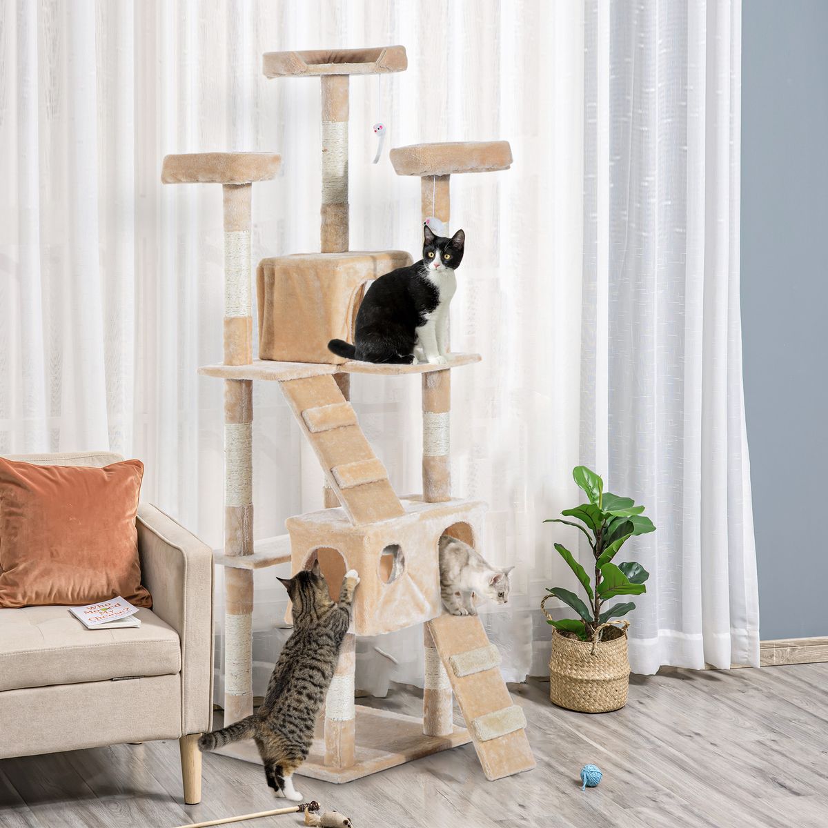 El rascador Mieles de PawHut, con una altura de 173 cm, es la opción ideal para mantener a tu gato entretenido y satisfecho. Este árbol rascador está diseñado con varias plataformas, ofreciendo a tu mascota un espacio ideal para jugar, escalar y descansar. Con tres plataformas amplias, dos casetas para relajarse, dos rampas con peldaños y tres ratones colgantes, este rascador proporciona todo lo que tu gato necesita para ejercitarse y divertirse. Además, sus columnas están recubiertas de cuerda de sisal, permitiendo que tu gato arañe sin dañar tus muebles.