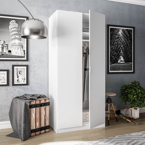 El armario Low Cost es un armario sencillo y funcional con 2 puertas batientes con tiradores, ideal como armario auxiliar o como armario de dormitorio para una persona. Cuenta con un interior que te sorprenderá por su capacidad pese a las ajustadas dimensiones exteriores del armario. En él encontrarás un perchero de lado a lado del armario donde colgar tu ropa en perchas, y un estante superior a modo de altillo. El suelo del armario queda completamente libre, para que tú decidas qué guardas aquí: cajas de almacenaje, zapatos… Este armario estará elaborado en melamina de alta calidad. Incluye instrucciones y todas las piezas necesarias para su puesta a punto. ¡No lo pienses más y consíguelo ya a un precio bestial en Embargosalobestia.com!