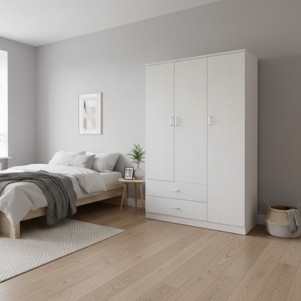 ¿Necesitas más espacio de almacenaje? Este estupendo armario modelo Boreal te proporcionará todo ese espacio. Está fabricado con melamina de alta calidad, siendo muy resistente y duradero. Está dividido en dos partes: el lado izquierdo está formado por 2 puertas y una barra metálica para colgar la ropa. En la parte inferior dispone de 2 cajones con tiradores metálicos. En el lado derecho cuenta con 1 puerta y 2 estantes, quedando 3 espacios para colocar tu ropa de forma ordenada. Gracias a su diseño elegante, moderno y en color blanco, combinará con el resto de decoración de tu hogar.