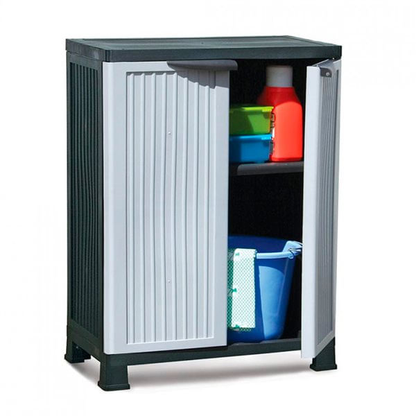 Armario de resina bajo de color gris con dos puertas abatibles y patas antideslizantes. En su interior cuenta con 1 balda para colocar objetos como productos de limpieza, cajas, herramientas o incluso puede utilizarse como zapatero o despensa. La balda intermedia soporta un peso máximo de 20 kilogramos y 10 kilogramos la balda inferior. Si se busca una mayor estabilidad, el armario puede ser ensamblado directamente a la pared quitando las patas. Armario fabricado en resina de alta resistencia y durabilidad y patas regulables. Este armario bajo es perfecto para colocarse en trateros, locales, talleres, terrazas, patios o comercios. Armario de resina exterior bajo Color: Gris Material: Resina Capacidad: 243 litros Soporta un total de 30 kg 2 baldas Uso interior y exterior Resistente a los rayos UV Lavar con agua y jabón neutro Fácil montaje sin herramientas ni tornillería Accesorios para sujeción a pared y candado no incluidos Dimensiones: