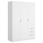 El armario modelo Essen con 3 puertas cuenta con un diseño inteligente que otorga múltiples espacios de almacenaje que te harán tener todas tus pertenencias mucho mejor organizadas y siempre con facilidad de acceso. Cuenta con un aspecto muy elegante y sobrio, además de hacerlo muy fácil de combinar con otros muebles. Lucirá de maravilla en tu habitación. El interior del mueble tiene espacio para colgar ropa, una repisa superior de gran resistencia, y 3 cajones accesibles desde fuera de las puertas que resultan de mucha ayuda para ropa más ligera. Fabricado en melamina de alta calidad, resistente al uso y de fácil montaje.