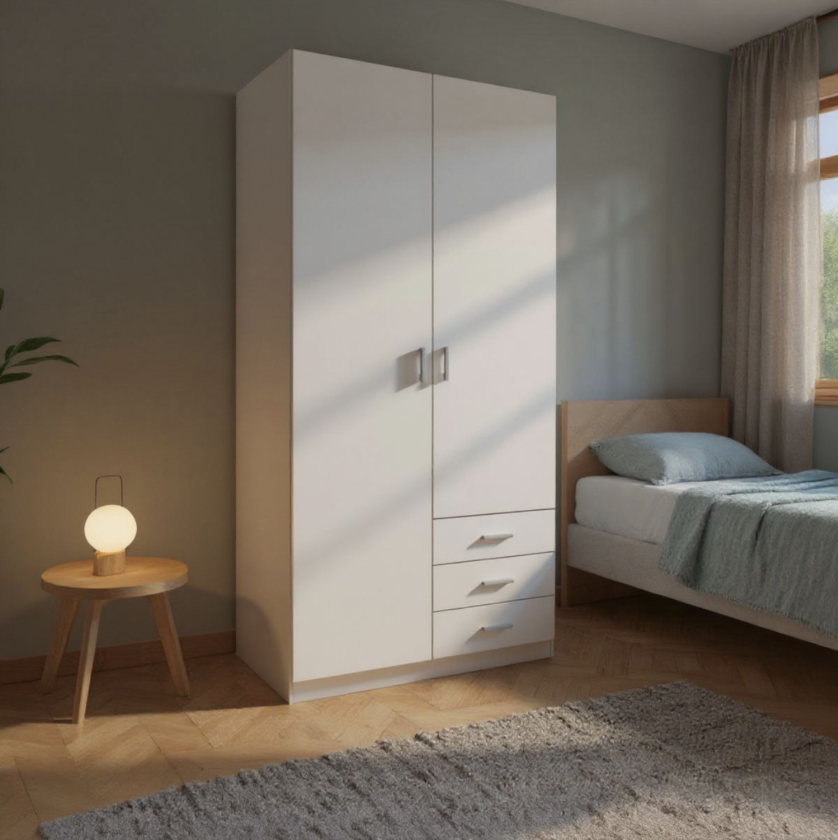 Lo mejor de este armario, además de su amplitud, es que permite organizar y clasificar las prendas en los distintos espacios que ofrece. Cuenta con 3 espacios diferenciados en su interior, así como tres cajones exteriores en los que poder guardar jerséis, camisetas o ropa interior sin tener que abrir las puertas. La zona interior del armario cuenta con estanterías arriba y abajo, por lo que podrás clasificar todo lo que necesites, lo tendrás a la mano y podrás encontrarlo de forma rápida. Tendrás un amplio espacio central con una barra para colgar la ropa y una estantería en la parte superior a modo de altillo. En definitiva, un completo armario con zonas diferenciadas de cajoneras, barra de ropa y estanterías.