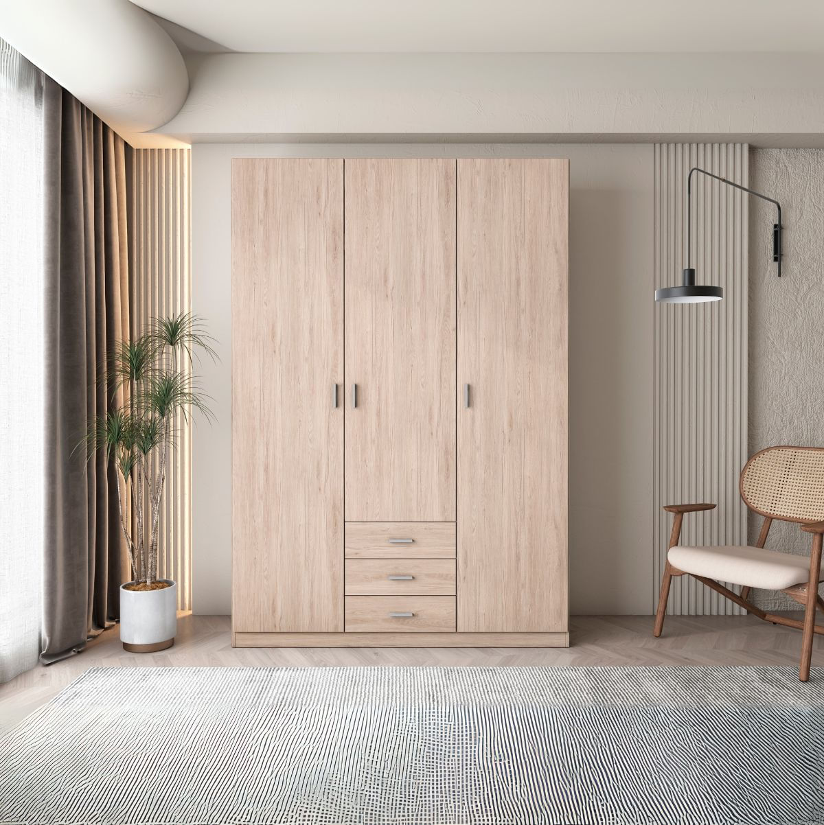 Espectacular armario Roma con 3 puertas y 3 cajones con tiradores para que puedas guardar todo lo que necesites y el espacio deje de ser un problema. Su interior, también está dividido de manera que tendrás varias opciones para guardar lo que tu prefieras: 1 espacio amplio para colgar la ropa, 5 compartimentos y 1 altillo, ideal para mantas o almohadas. Este armario de gran capacidad está acabado en melamina de alta calidad y fabricado en España. Se trata de mobiliario en kit para montaje, con todas las herramientas necesarias y un folleto explicativo, que hace que sea muy sencillo el montaje y rápido de hacer.