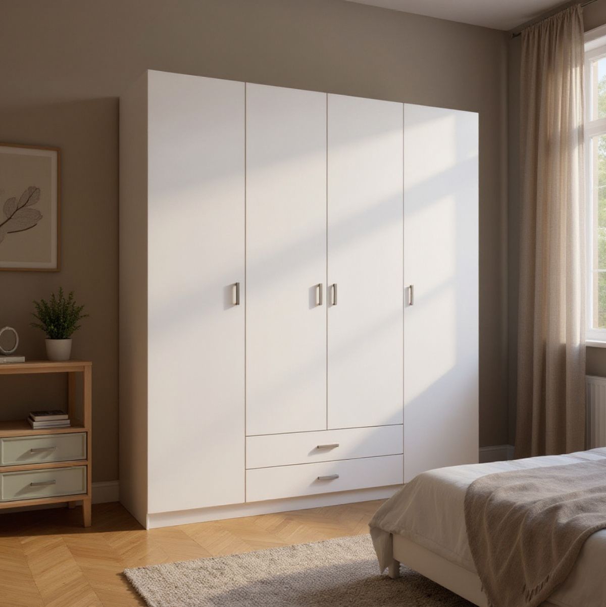 El armario Roma combina diseño y versatilidad para ofrecerte un mueble práctico y funcional. Lo mejor de este armario, además de su amplitud, es que permite organizar y clasificar las prendas en los distintos espacios que ofrece. En su exterior vemos 4 grandes puertas y 2 cajones. Si nos adentramos a su interior, vemos 3 espacios diferenciados en los que poder guardar tanto la ropa del día a día como de otras temporadas. Las zonas laterales del armario cuentan con 4 estantes cada una, por lo que podrás clasificar todo lo que necesites. Además, gracias a la barra para colgar y a sus repisas extra anchas, podrás colocar todo tipo de prendas, sin importar su tamaño o peso. Es un mueble fabricado en melamina de buena calidad y con una superficie lisa para combinar sin problema con el resto de mobiliario. El armario Roma destaca por su diseño elegante y minimalista, así como por su polivalencia. Consigue este fantástico armario al mejor precio en Embargosalobestia y presume de dormitorio.