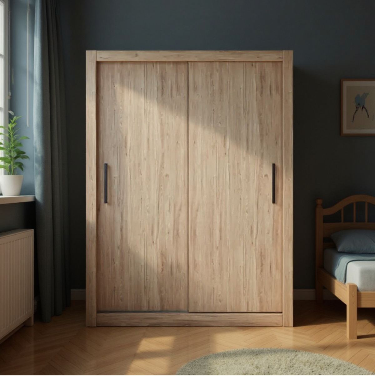 Completa tu dormitorio con este encantador armario modelo Sava de 201 cm de alto, 150 de ancho y 58,7 cm de profundidad, completo y amplio, ideal para organizar toda tu ropa e incluso la de tu pareja si vives acompañado, compuesto por 2 puertas correderas optimizará al máximo el espacio. En su interior, podrás encontrar dos altillos y dos barras para colgar todas tus perchas. Cuenta con tiradores en color grafito y su color neutro combinará a la perfección con cualquier decoración y color de tu dormitorio. No lo pienses más y hazte con tu armario Sava al mejor precio.