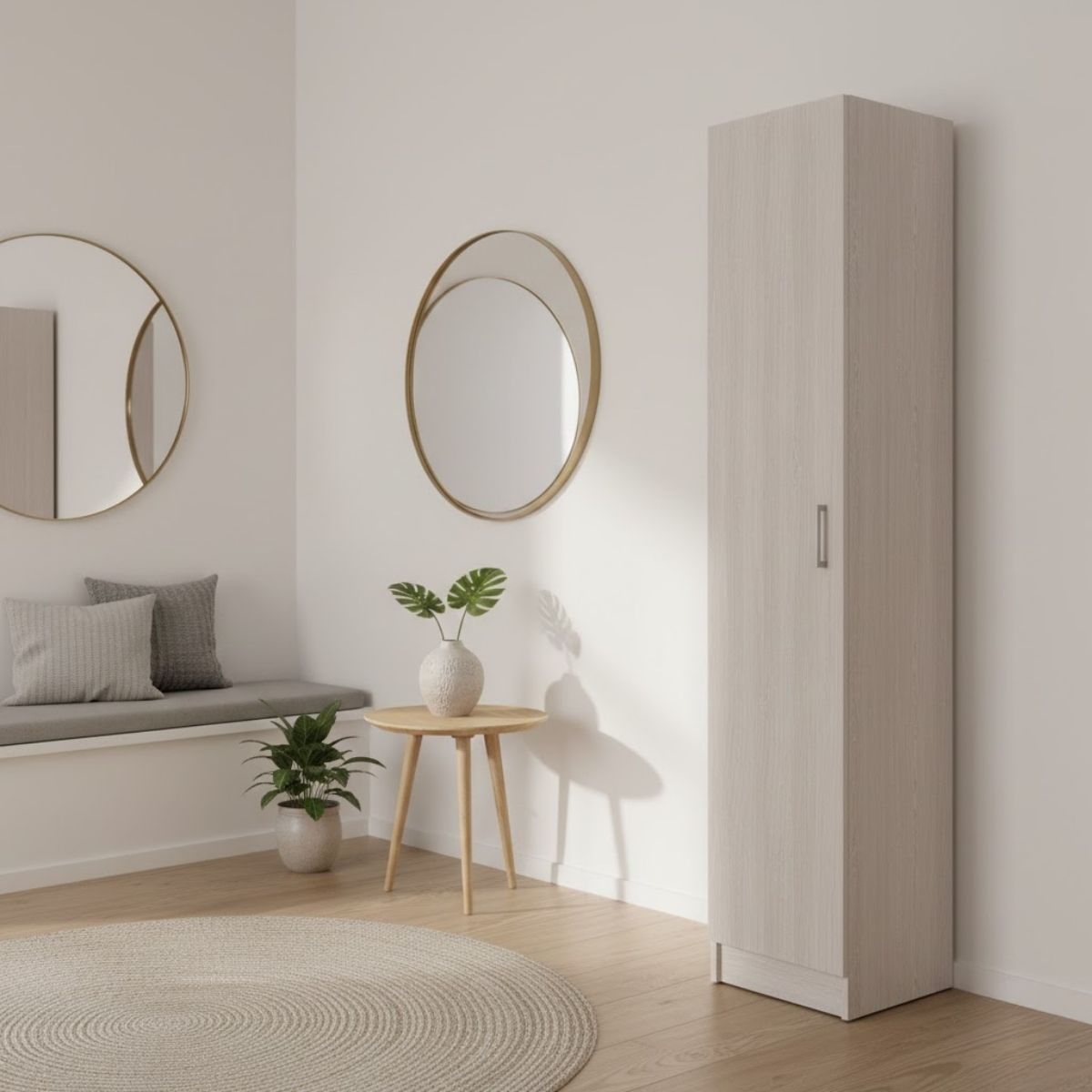 ¿Qué te parecería contar con un armario auxiliar para guardar los productos de limpieza o a modo de despensa? Entonces te encantará este armario escobero modelo Use de 1 puerta. Conseguirás un desahogo para guardar aquellas cosas que necesites. Contiene 4 espacios separados por estantes para guardar todo aquello que quieras y así ganar espacio en el ambiente del hogar que tú escojas. Todo el armario está fabricado en melamina de alta calidad por lo que la durabilidad y resistencia están garantizadas. El tirador para la apertura de la puerta está fabricado en PVC con cantos cromado. Se trata de un mueble de kit para montaje, con todas las herramientas necesarias y manual de instrucciones, que hace que sea un montaje muy sencillo y rápido. ¡Guarda todo lo que necesites en tu nuevo armario auxiliar!