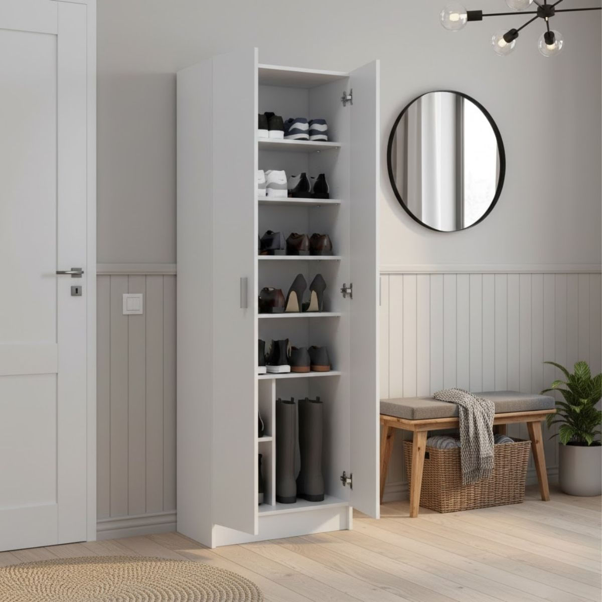 Este es un armario multiusos de 2 puertas con 5 estantes regulables en altura donde tendrás todo lo que necesites en orden. Es ideal para darle diferentes maneras de uso ya que vale para todo lo que necesites. Está fabricado en melamina de alta calidad en color blanco con dos puertas. Bisagras y soportes de los estantes metálicos y con tacos ABS quita ruidos y anti rayado. El interior del mueble también es blanco y los estantes pueden colocarse varias posiciones en altura. El peso máximo soportado es de 45 kg y por balda 8 kg.