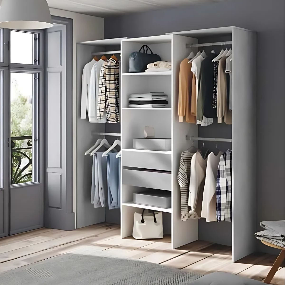 Las características clave incluyen dos cajones con frentes en color cemento y guías correderas metálicas para un deslizamiento suave, lo que facilita el acceso y la organización de la ropa y los accesorios. Además, dispone de cuatro estantes, dos de los cuales son regulables en altura, brindando flexibilidad para adaptarse a diferentes tipos de prendas y accesorios. Las cuatro barras de colgar en aluminio son extraíbles y pueden soportar hasta 5 kg cada una, ofreciendo un espacio práctico para colgar abrigos, camisas y vestidos. Los estantes metálicos cuentan con un soporte resistente y pueden soportar hasta 8 kg cada uno, lo que garantiza una capacidad de almacenamiento confiable para una variedad de artículos. Además, el armario viene con tacos ABS para la parte inferior del mueble, diseñados para reducir el ruido y prevenir arañazos en el suelo. Se incluyen dispositivos de fijación para montar el mueble en la pared, asegurando su estabilidad y seguridad. Requiere montaje, pero se suministran instrucciones detalladas para facilitar el proceso. En resumen, este armario vestidor sin puertas es una solución versátil y elegante para maximizar el espacio de almacenamiento en dormitorios con espacio limitado, ofreciendo funcionalidad, estilo y durabilidad en un diseño compacto y moderno.