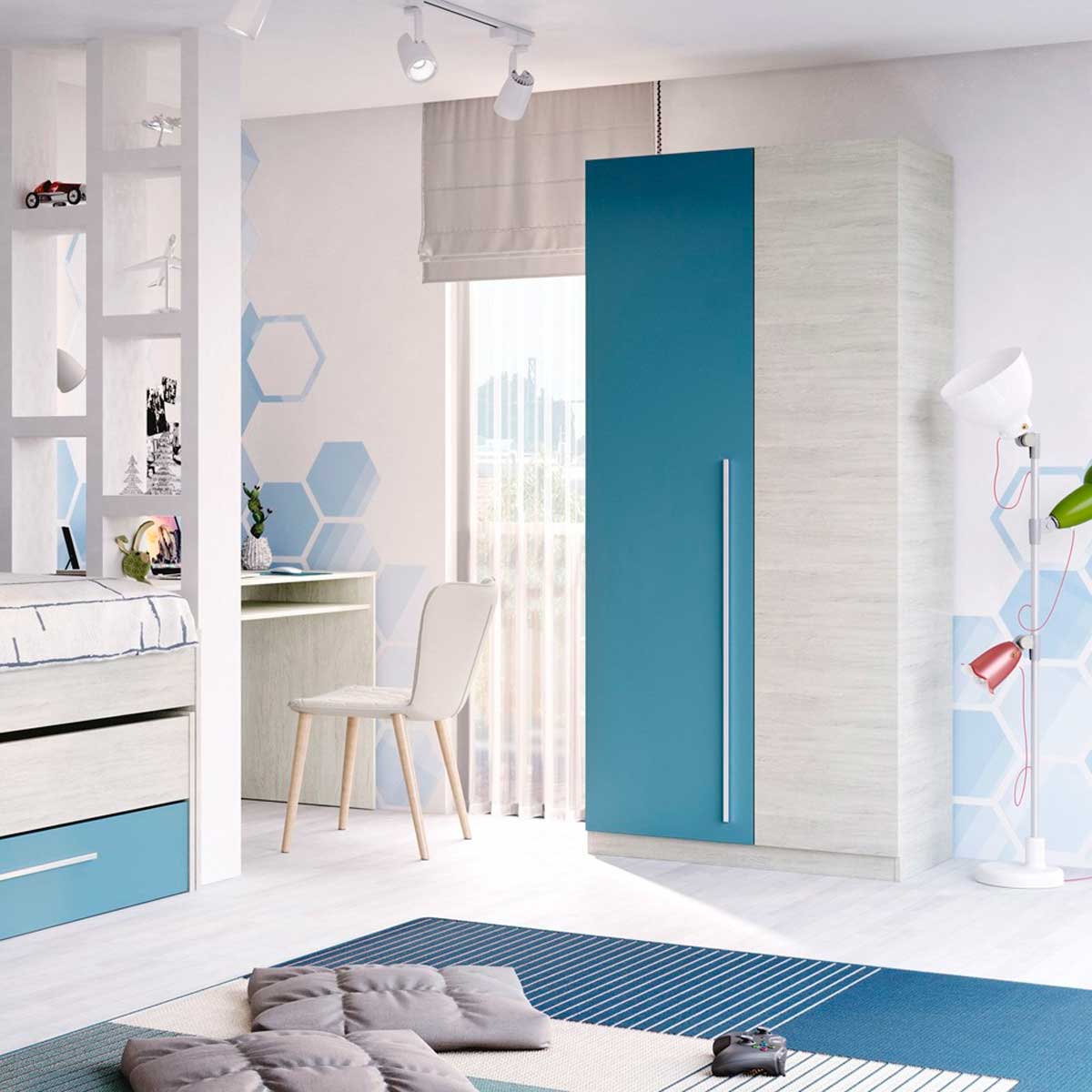 El armario modelo WIC es perfecto para decorar una habitación juvenil, cuenta con 2 puertas, 1 barra para colgar prendas y 3 estantes para organizar tu ropa, calzado, mochilas y todo lo que necesites. Está fabricado en tablero de partículas melaminizado, la barra es de aluminio y sus tiradores son de ABS de alta resistencia pintados en color blanco. Además, cuenta con tacos ABS para minimizar el daño que pueda sufrir en su parte inferior a la hora de moverlo por la estancia y para darle un mayor soporte y estabilidad al armario WIC. ¡Hazte con el tuyo ya!