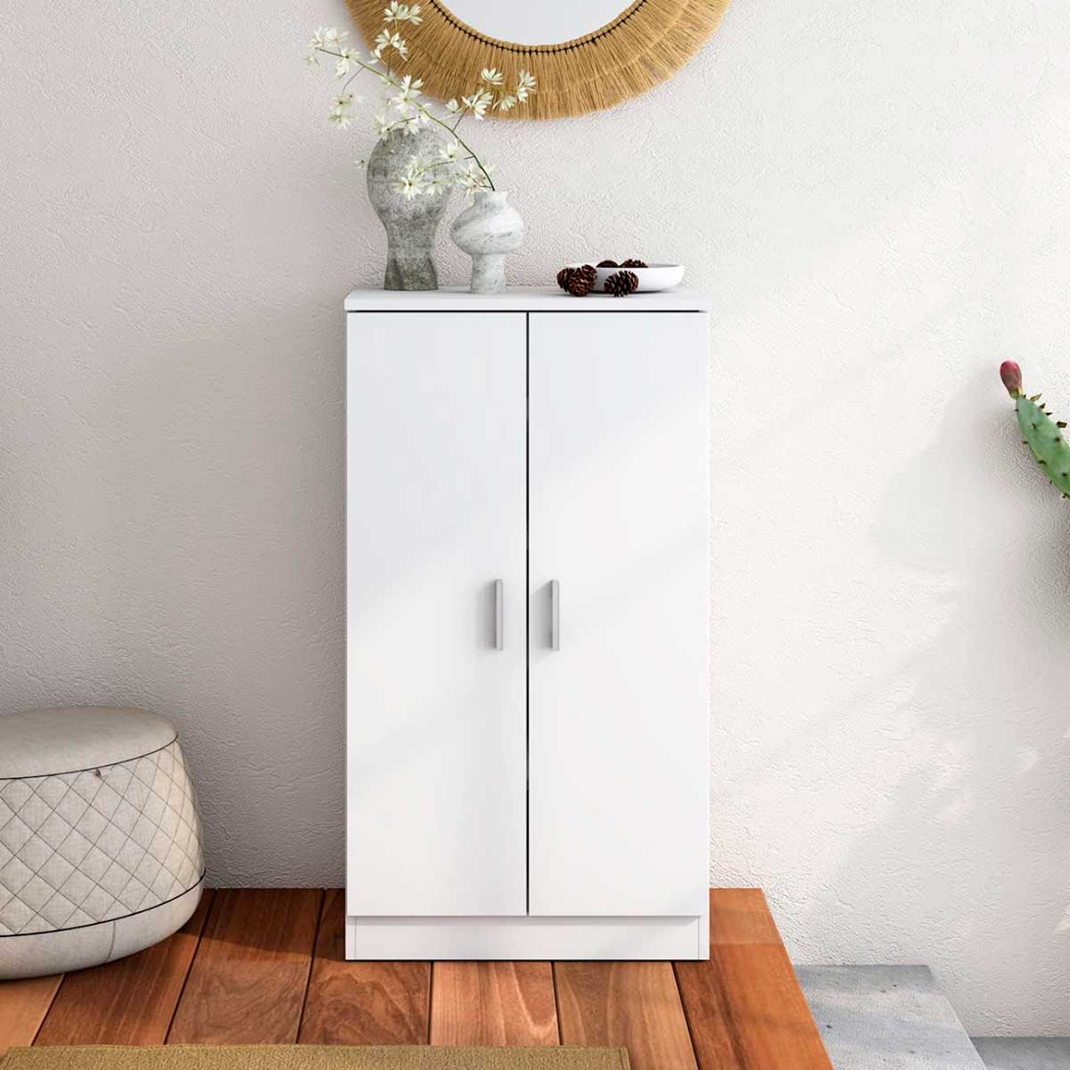 Armario zapatero de dos puertas y varios estantes en su interior. Ideal para aprovechar al máximo tu espacio y tener todo tu calzado organizado. Fabricado en melamina de alta calidad en color natural. Podrás colocarlo en la estancia de tu hogar que prefieras gracias a su fabuloso diseño. Se acabó eso de tener todos tus zapatos esturreados por la habitación, ahora dispones de un espacio específico para colocarlos y tenerlos siempre a mano. Tiene una capacidad de hasta 10 pares y dispone de 4 baldas multiposición, lo que lo hace, a su vez, muy práctico.