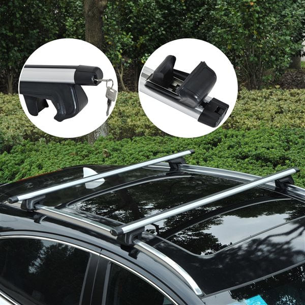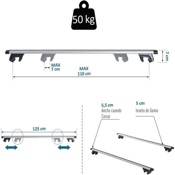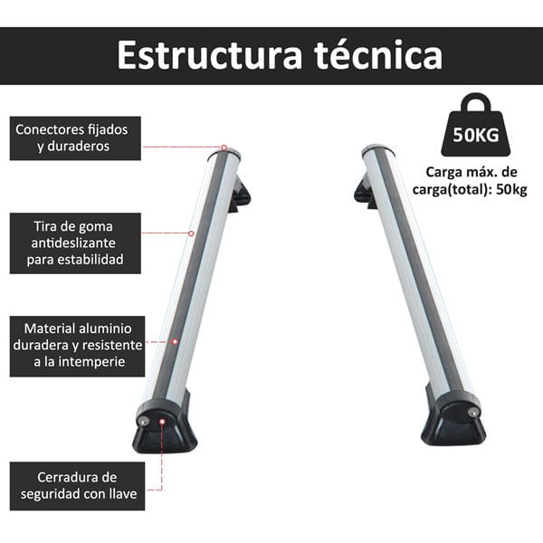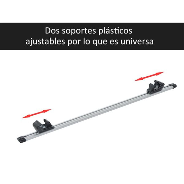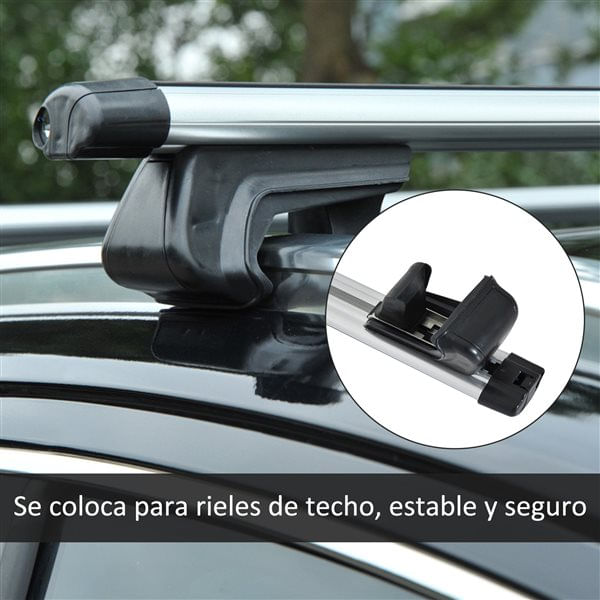 Características Apto para casi todo tipo de vehículos con rieles en el techo Hechas de aluminio de alta calidad, duradero y resistente Tamaño compacto, funcional y robusto Apto para coche con ancho menos de 110cm. Barras con dos soportes plásticos ajustables según anchura Tira de goma antideslizante en el centro para una mayor estabilidad Viene con 1 cerradura con llave en cada barra para obtener mayor protección contra robos Fácil de montar y desmontar en un par de minutos. Railing integrado. Especificaciones
