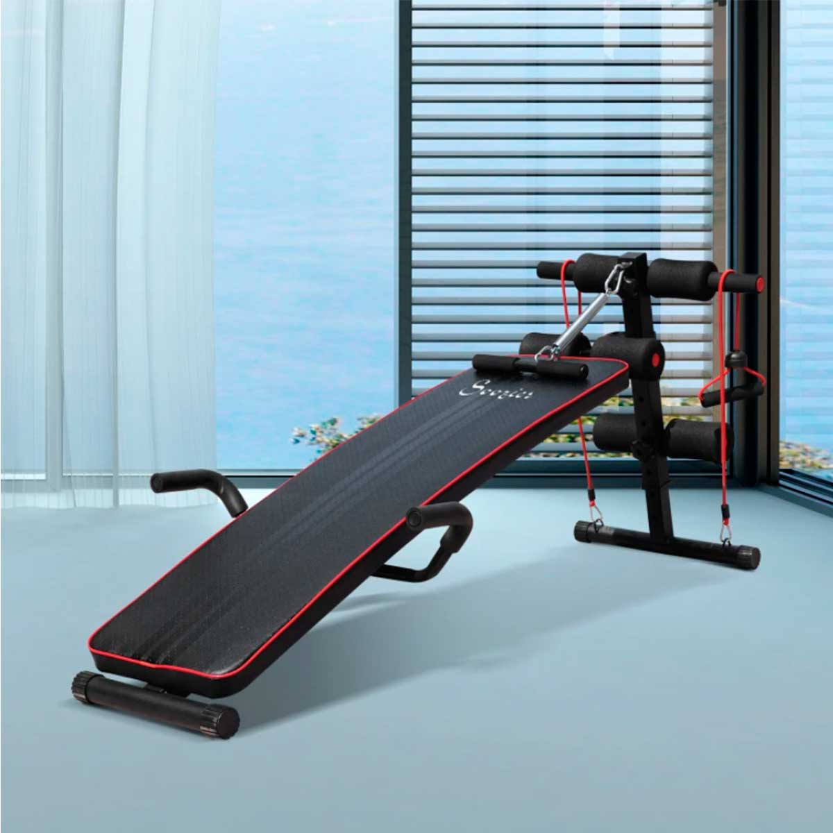 ¿Te gustaría ponerte en forma en casa? Este completo banco de abdominales de Homcom te permitirá hacer abdominales, curl-ups, elevaciones de piernas y flexiones, de manera que podrás ejercitar toda tu musculación. Es un banco fabricado con estructura de acero y un grueso acolchado de espuma, capaz de soportar hasta 120kg de peso, ofreciéndote un cómodo y seguro soporte para practicar tus ejercicios. Las correas de tobillo son ajustables en 5 niveles, ajustándose a la estatura de la persona que lo vaya a utilizar. Se completa con 2 ganchos para conectar las 2 cuerdas que incluye para poder realizar ejercicios de estiramientos. También incluye un muelle para ejercicios de fuerza que podrás poner y quitar según te convenga. ¿Lo mejor? ¡Que lo puedes conseguir a un precio de chollo!