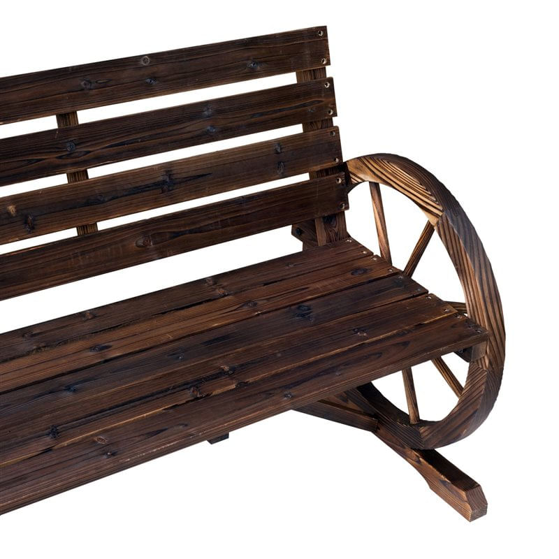 Si no te conformas con un banco convencional y te gusta el estilo rústico y de campo, estás de suerte. Este banco de Outsunny con laterales en forma de rueda de carro que, además de ser decorativas, su forma redondeada superior hace a su vez de apoyabrazos. El respaldo y asiento con listones favorece una buena transpiración. Gracias a su gran resistencia, es capaz de soportar una carga máxima de 250 kg, ideal para 2 personas. Cuenta con tratamiento Flame Shield, un tratamiento al fuego que, aparte de dar un aspecto envejecido, protege del viento y otras inclemencias del tiempo. Su aspecto envejecido es perfecto para decorar tu jardín con un toque vintage, mientras descansas al aire libre en tu patio, terraza o cualquier otro espacio exterior.
