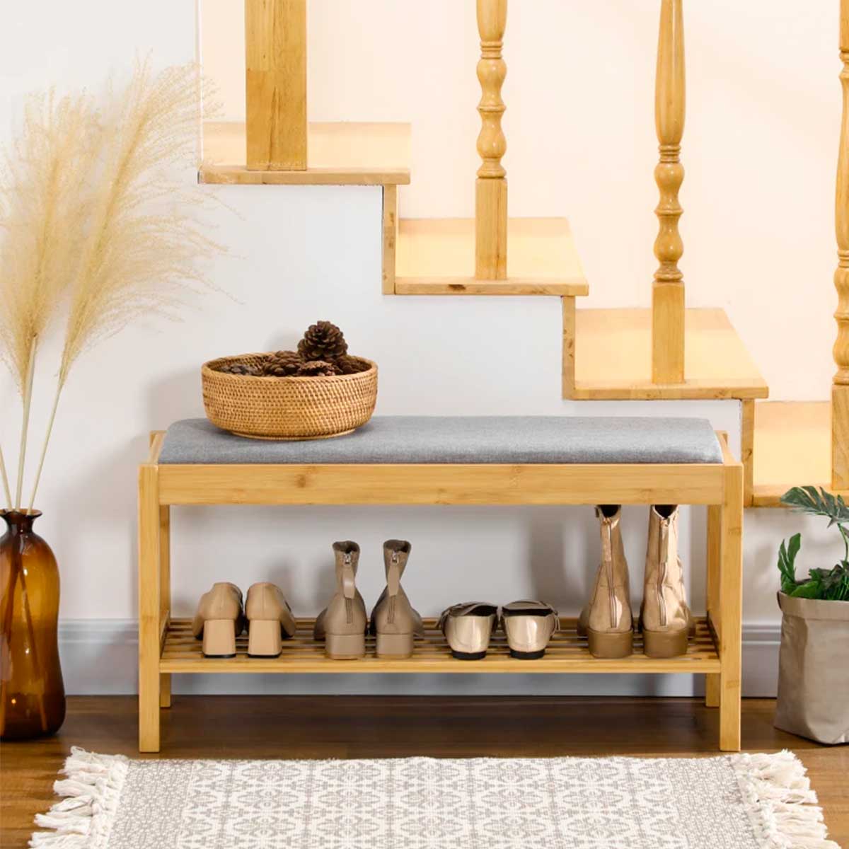 Si no sabes donde organizar o almacenar tu calzado, te traemos este discreto y precioso zapatero con acabado en madera natural. Tapizado con tela y con un estante de listones de madera en la parte inferior, conforman el zapatero perfecto para situarlo tanto en tu dormitorio, vestidor o vestíbulo. Cómodo, practico y moderno el zapatero Kirov es la perfecta combinación para añadir a tu hogar. Gracias a sus patas, podrás limpiar por debajo del mueble sin ningún problema. Su estante inferior tiene capacidad para guardar hasta 3 pares de zapatos, cajas de almacenaje o todo lo que necesites. El cuerpo principal del zapatero está fabricado en bambú 100% natural haciéndolo de lo más resistente al paso del tiempo y la humedad. Su estante inferior con diseño de listones facilita el paso del aire y evita la acumulación de humedad y polvo. ¡Descubre el bonito y práctico zapatero de Homcom a un precio de escándalo!