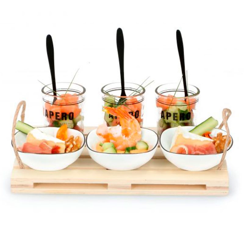 Sorprende a tus invitados con esta bandeja y accesorios para aperitivos de la marca Alpina. La bandeja es un mini palet con cuerdas en los laterales a modo de asa y viene con 3 cuencos de cerámica, 3 vasos de vidrio y 3 cucharas. Todo lo necesario para crear un rico aperitivo: puedes colocar ensaladas, quesos o patés en los cuencos y en los vasos añadir aderezos, miel o mermeladas. Este conjunto es muy decorativo y aportará mucho estilo a tu mesa.