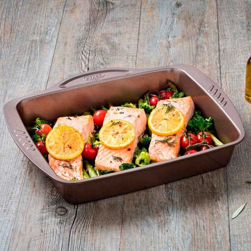 Con la bandeja honda para horno modelo Asimetría de la marca Pyrex podrás cocinar ricas comidas de manera saludable como asados, verduras, carnes o pescados. Está fabricada en acero carbonatado que permite una cocción uniforme y homogénea. Podrás manejarla con total comodidad gracias a las asas que vienen en el borde. Su fondo es rugoso y antiadherente, para que puedas retirar tus alimentos fácilmente cuando estén listos. Es apta para horno, congelador, frigorífico y soporta temperaturas máximas de hasta 250ºC y mínimas de hasta -20ºC. Además, también es apta para lavavajillas.
