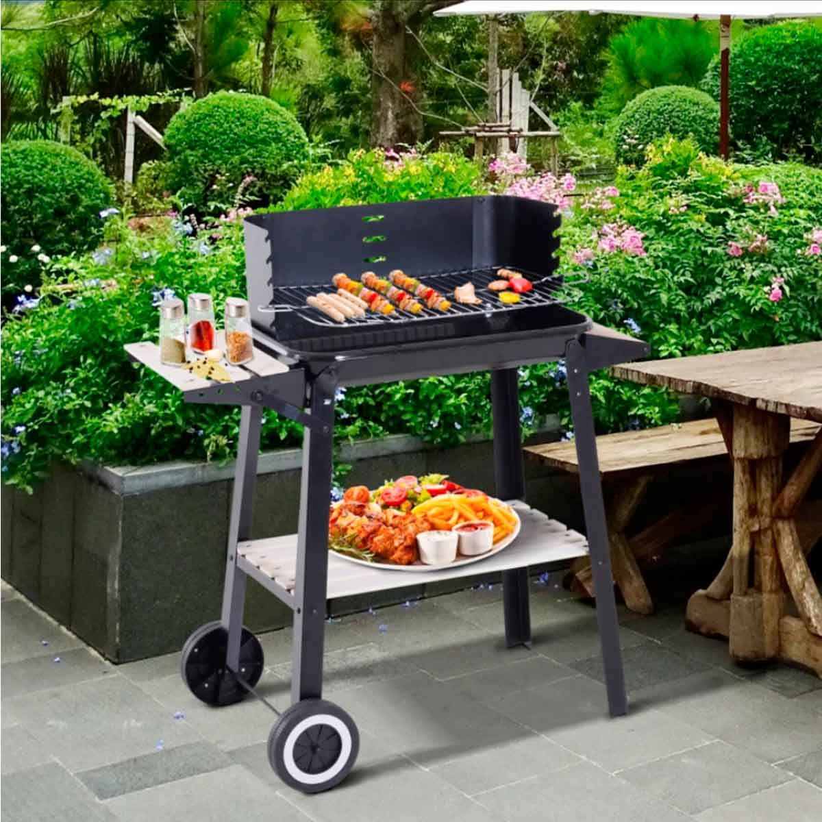 Esta estupenda barbacoa de Outsunny es la opción perfecta para cualquier espacio exterior. La estructura está fabricada de metal con revestimiento de porcelana en el marco, materiales muy resistentes y de gran calidad para una alta durabilidad. Incorpora protecciones laterales para el viento, así como un parabrisas ajustable en 5 niveles de altura que te ayudará a controlar la distancia de los alimentos del fuego y la temperatura de la barbacoa. La parrilla incorpora 2 asas para un fácil ajuste y extracción. Dispone de 2 estantes, uno lateral donde poder apoyar el plato, las pinzas o las especias; y otro inferior para poder dejar la vajilla, vasos o cualquier cosa que necesites a mano. Cuenta con 2 ruedas y 2 patas antideslizantes para que puedas transportarlo fácilmente. ¡No lo pienses más y disfruta de esas barbacoas de verano que tanto te gustan a un precio de chollo!