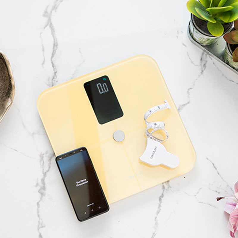 La báscula de baño modelo Surface Precision 10400 Smart Healthy Vision de la marca Cecotec cuenta con una gran pantalla y conectividad con Smartphone vía Bluetooth 4.0 para un seguimiento más preciso de los 15 parámetros básicos, además dispone de función de medición del pulso. Viene con una batería de litio de 600mAh para olvidarte de las pilas y que puedas usarla en cualquier momento y lugar. Dispone de un método de medición de impedancia bioeléctrica (BIA) con un análisis corporal completo, con medición precisa de 15 parámetros básicos tales como peso, IMC, % grasa corporal, peso sin grasa, grasa subcutánea, grasa visceral, % de agua, masa muscular, masa ósea, % músculo esquelético, proteína, BMR, edad corporal, frecuencia cardiaca y equilibrio corporal. Cuenta con una carga máxima de 180kg e incluye una práctica cinta métrica para que puedas tener un control preciso de tu volumen. Está fabricada en cristal templado de color.
