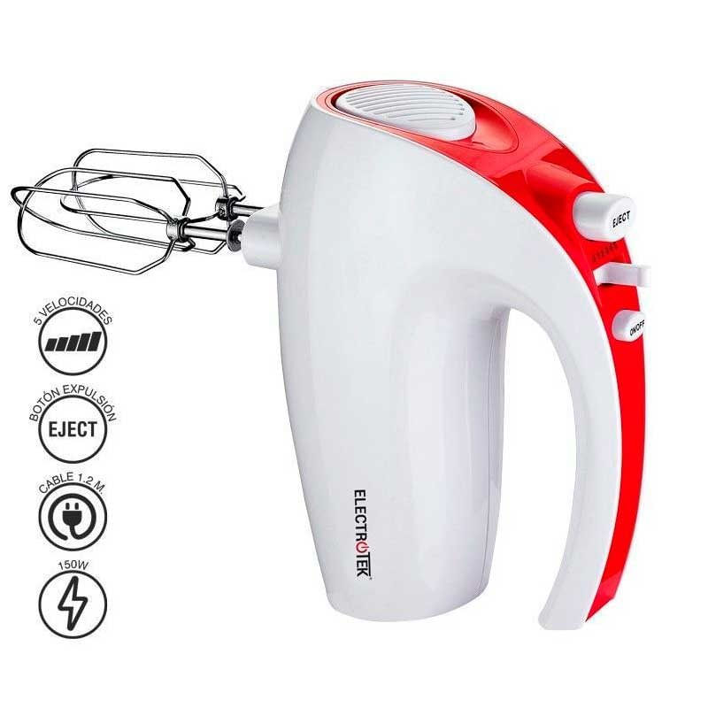 La batidora-amasadora modelo ET-BA150 de la marca Electrotek es ideal para llevar a cabo todo tipo de mezclas de manera fácil y rápida. Un accesorio imprescindible para los amantes de la repostería. Cuenta con una potencia de 150W e incluye 2 ganchos para masa y 2 varillas intercambiables para que puedas escoger. Para intercambiarlos será tan sencillo como apretar el botón superior "eject”, que soltará los que hasta el momento hayas estado utilizando para que puedas colocar los otros. Gracias a su tamaño compacto y a su peso ligero será muy sencilla de manejar.