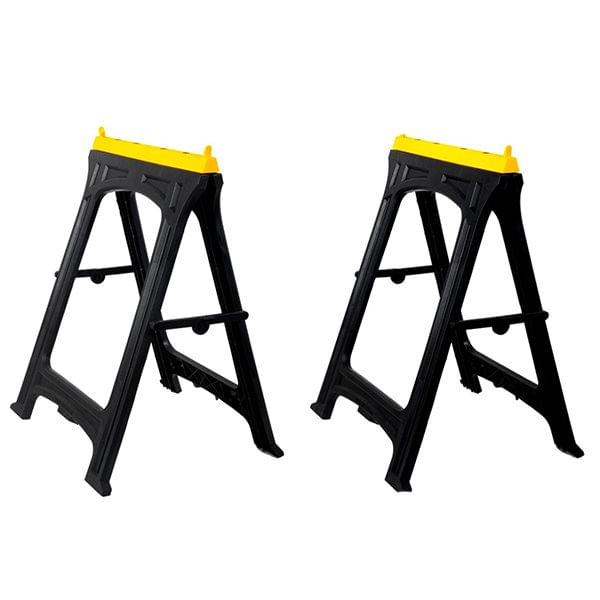 Estos dos caballetes de Kinzo son útiles para todo tipo de trabajos. Por ejemplo, puede usarlos como un caballo de sierra para cortar tablas. Para evitar que una tabla se deslice, colóquela entre los pasadores. Usted decide si coloca los pasadores en el soporte de trabajo y dónde lo coloca. En el lateral hay una regla, tanto métrica como en pulgadas. Estos caballetes también pueden servir como base para una mesa temporal. Útil si tienes una gran fiesta en el jardín, por ejemplo. ¿Y no usas los caballetes? Luego puede doblarlos fácilmente y apenas ocupan espacio cuando los almacena. Los caballetes de sierra están hechos de polipropileno, un tipo de plástico fuerte y prácticamente irrompible. La capacidad de carga máxima por caballete de sierra es de 170 kg. - Caballetes Kinzo - 2 piezas - Material: polipropileno - Cada uno soporta hasta 170kg - Incluye regla lateral métrica - Incluye regla lateral en pulgadas - Plegables - No ocupan espacio - Gran funcionalidad - De calidad