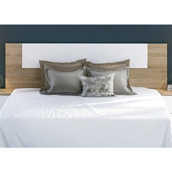 Cabecero de estilo moderno modelo Champion en color cambria y blanco. Un práctico cabecero de 160 cm que se instala en la pared. Perfecto para dormitorios de estilo moderno y minimalista. Gracias a su tablero de melamina de alta calidad, este cabecero es muy fácil de limpiar y nos ayuda a evitar ácaros y polvo en nuestro dormitorio. Se incluyen los herrajes metálicos de alta calidad, perfectos para instalar el cabecero en la pared con facilidad.