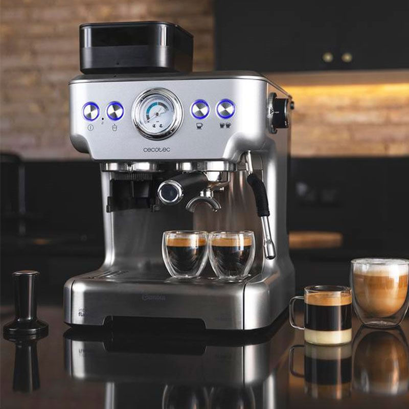 Monta una auténtica cafetería profesional en casa con esta cafetera express Power Espresso 20 Barista Aromax de Cecotec. Funciona con café en grano y dispone de un depósito de 250g que la conecta con un molinillo con 15 niveles de molido. Con ella podrás preparar deliciosos espressos y cappuccinos. Entre sus accesorios encontramos un manómetro de control para ver la presión, un brazo portafiltros para preparar 1 o 2 cafés a la vez, 1 espumador de leche orientable y 1 conducto de agua caliente para preparar otras bebidas como infusiones. ¡Los detalles cuentan! En la parte superior dispone de una bandeja calienta tazas para evitar el contraste térmico. Con 2900W de potencia y 20 bares de presión, desearás que llegue la hora del café para degustar todo su sabor y aroma. ¡Hazte con la tuya!