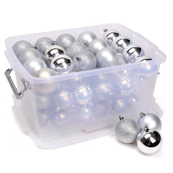 Decora tu árbol o centro de mesa con este completo pack de adornos navideños. Hasta un total de 70 bolas encontrarás dentro de esta práctica caja de plástico transparente, con tapa y asas laterales para facilitar su transporte y almacenaje. Son coloridas, de distinto diámetro y con acabados en mate, brillante y purpurina. Todas ellas están fabricadas con material inastillable que al romperse no produce fragmentos agudos, ni cortantes. Son altamente resistentes al calor y de larga durabilidad. Incorporan agujero para que se puedan colgar o engarzar acorde a la creatividad que pretendas desarrollar.