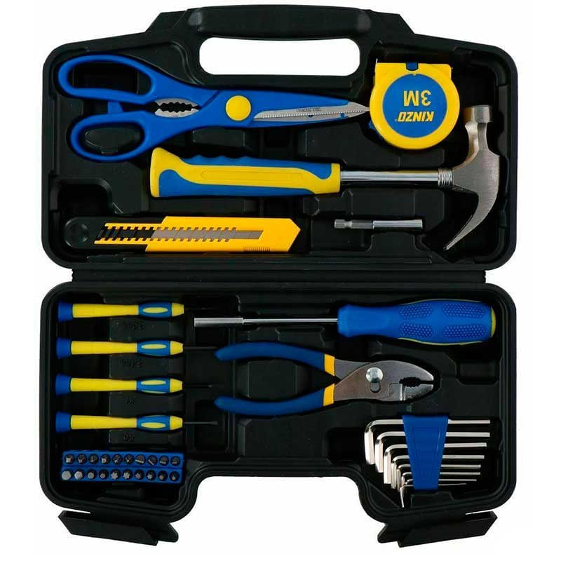 Es útil tener siempre a mano un conjunto de herramientas básicas de reparación y mantenimiento. Este set de Kinzo está especialmente diseñado para uso doméstico y contiene todo lo necesario para las tareas más comunes de la casa. Imagina que quieres arreglar, desatornillar, medir o simplemente colgar un cuadro... Con este set tienes todo a tu alcance en una sola caja. Las 39 herramientas vienen en una caja de PVC resistente, compacta y fácil de transportar. El conjunto contiene: 8 llaves Allen (1,5-2-2,5-3-4-5-5,5-6 mm), 20 bits, 1 alicates combinados de 6”, 1 soporte para puntas de ¼”, 4 destornilladores de precisión, 1 portapuntas magnético, 1 cuchillo multiusos Stanley, 1 cinta métrica (3 metros) y 1 tijeras para hogar.