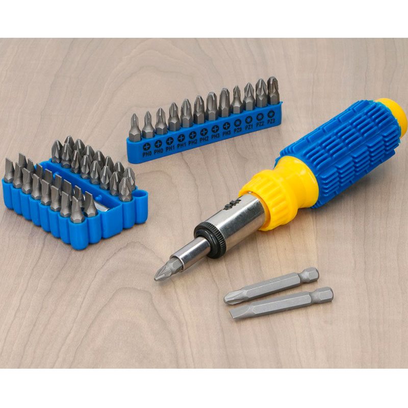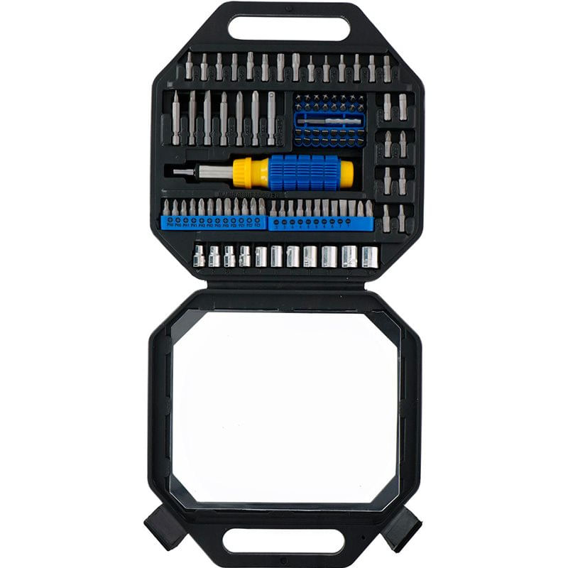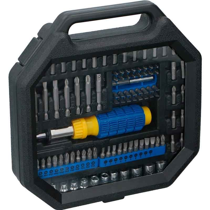¿Te gusta realizar trabajos manuales? Entonces este set de 99 piezas de herramientas de la marca Kinzo es ideal para ti. Viene en una caja de herramientas y contiene un destornillador de trinquete con 2 adaptadores, 11 enchufes y 84 puntas cortas y largas en una gran variedad de tamaños y formas. Gracias a que vienen en una caja mantendrás todo bien organizado y podrás llevarlo a todas partes fácilmente. El juego de puntas de destornillador se adapta a todo tipo de tornillos, desde una cruz Torx, Phillips y Pozidriv hasta cabezas ranuradas para tornillos planos, puntas para tornillos cuadrados y también puntas para Allen. Las tapas, brocas y adaptadores están hechos de acero. El mango del destornillador de trinquete está hecho de ABS con rebordes para un agarre adicional.