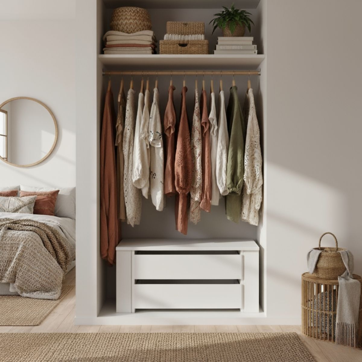 La estructura está diseñada para un uso diario, permitiendo abrir y cerrar los cajones de manera cómoda y sin esfuerzo. Esta característica resulta especialmente útil en espacios donde la accesibilidad y la organización son esenciales. Además, al incorporar una cajonera dentro del armario, puedes tener tus pertenencias más cerca, evitando la necesidad de buscar en distintas zonas y optimizando el tiempo al vestirte o preparar tus objetos personales. Su montaje es sencillo y rápido, pensado para que puedas instalarla sin complicaciones. En conjunto, esta cajonera interior de 2 cajones se convierte en un accesorio práctico y funcional que mejora la organización del hogar, aprovechando cada rincón del armario y ayudando a mantener el espacio limpio, ordenado y accesible.