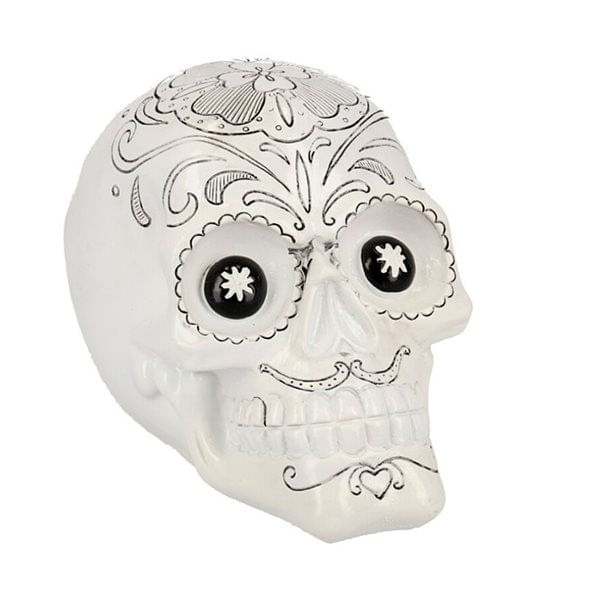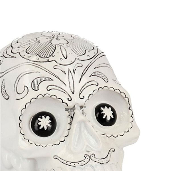 Calavera de decoración Flores de color blanco con detalles en negro. Fundida en la mejor resina. Las figuras son complementos decorativos muy interesantes cuando queremos realzar o potenciar algún aspecto concreto de nuestra decoración. Si eres amante de las calaveras mexicanas, seguro que querrás integrar en tu decoración esta bonita figura. Además, las calaveras cuentan con una simbología fascinante, ya que contrariamente a lo que podemos suponer como un hecho triste y gris en el representar a la propia muerte, representa una concepción de la vida y de la muerte muy distinta: más optimista, de que el muerto no se va del todo y permanece.