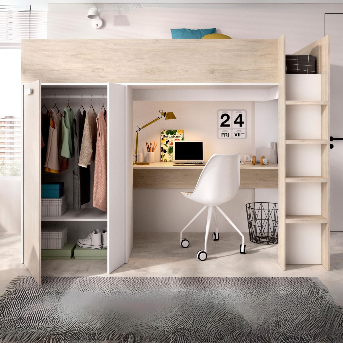 La nueva cama estudio Spylo es una solución inteligente para espacios reducidos, diseñada para maximizar la optimización y organización del espacio disponible. Esta versátil pieza de mobiliario ofrece funcionalidad múltiple al combinar una cama, una mesa de estudio amplia y un armario cerrado, todo en un mismo lugar. La cama se encuentra en la parte superior del mueble y puede alojar colchones de tamaño estándar de 90x190 o 90x200 cm, eliminando la necesidad de un somier gracias a su base con ventilación. Su diseño frontal de acceso permite su instalación en espacios estrechos sin requerir espacio adicional en los laterales. El armario integrado ofrece espacio de almacenamiento adicional con una barra para colgar ropa y un estante, además de la posibilidad de ubicar cajas de almacenaje en la parte inferior. La aplicación de color del mueble permite una integración armoniosa en cualquier ambiente. El montaje de la cama estudio Spylo es sencillo gracias a los herrajes incluidos y las instrucciones detalladas paso a paso. Los materiales de alta calidad garantizan una estructura sólida y duradera, con tacos ABS que reducen el ruido y protegen contra rayaduras.