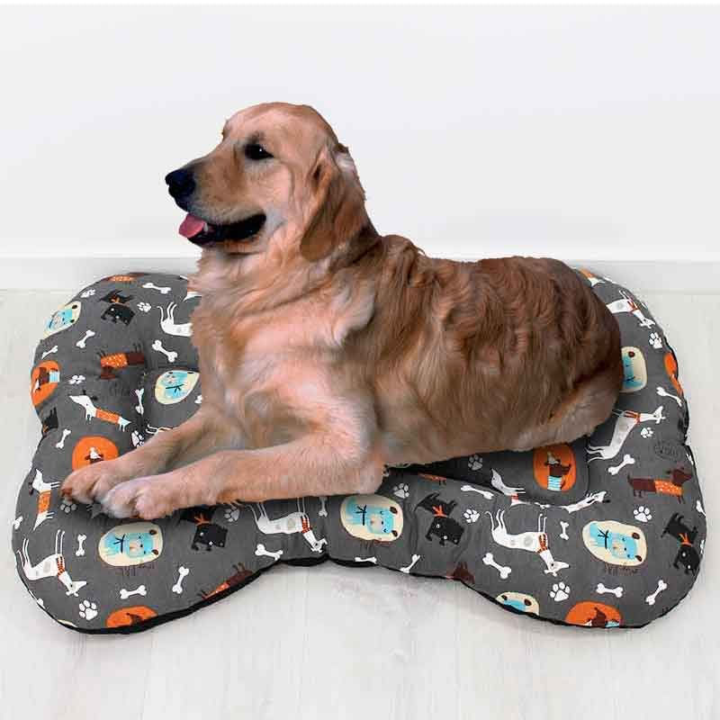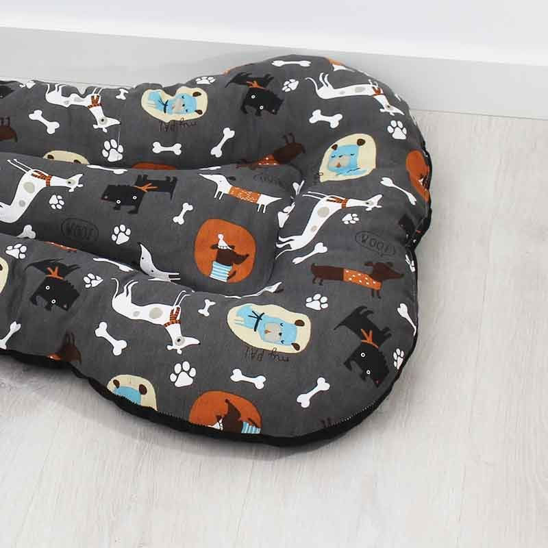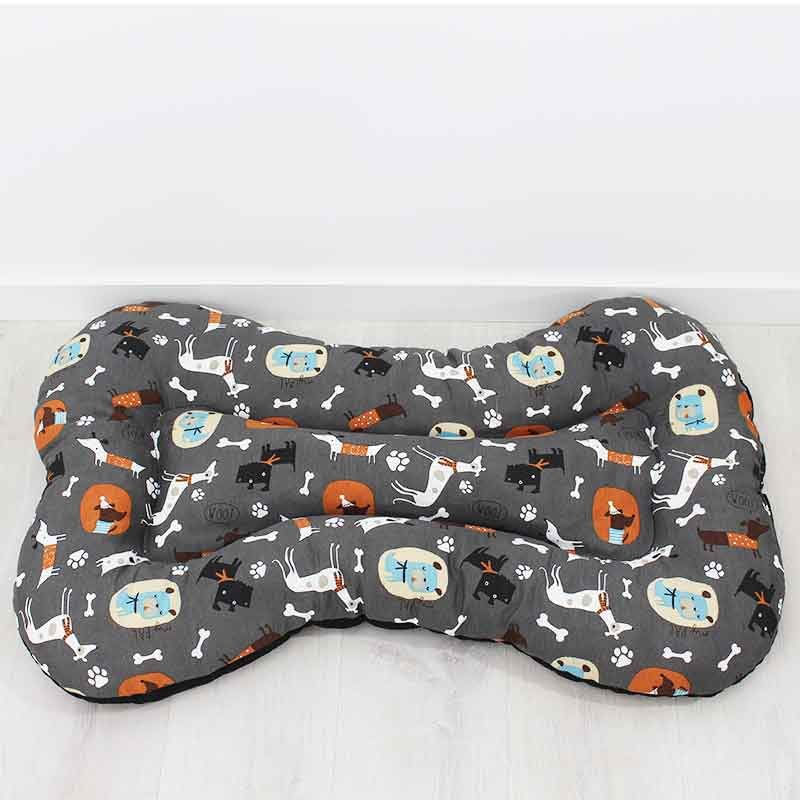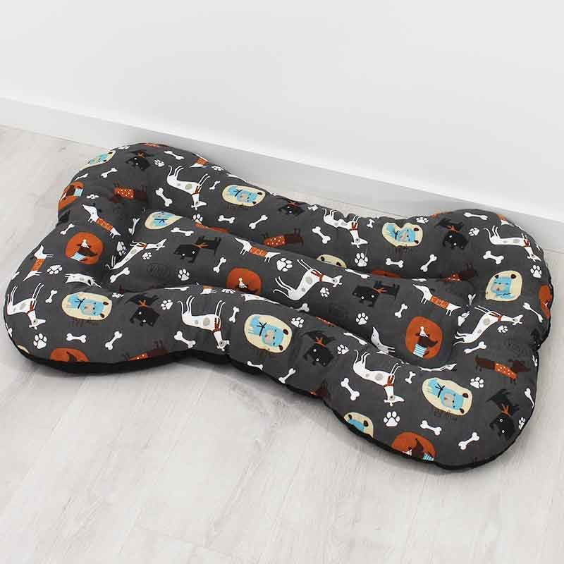 Con esta original cama con forma de hueso estarás ofreciendo a tu mascota un lugar mullido y cómodo en el que echarse y descansar de forma relajada. Por su tamaño es ideal para perros pequeños o medianos, está fabricada con relleno consistente y esponjoso para que se adapte al cuerpo perfectamente a su cuerpo. Su grosor de 7 centímetros, asegura un descanso confortable durante muchas horas. Este tipo de camas son las preferidas por las mascotas, ya que debido a su tamaño las puedes colocar en cualquier lugar de la casa y moverlas a dónde tu vayas a estar, tu mascota siempre estará relajada cerquita de ti, en el salón, en la cocina o en la habitación. El fondo de la cama viene con estampado.