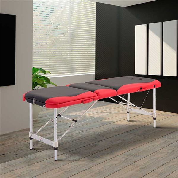 Camilla de masaje plegable de 3 zonas con marco de aluminio resistente ideal para fisioterapeutas profesionales, estudiantes, centros de estética, masajes e incluso estudios de tatuajes. Nuestras camillas de masaje portátiles tienen un acolchado de 5 cm de espuma de gran calidad que ofrece una experiencia de masaje agradable y un óptimo descanso, siendo resistentes a aceites para masajes. El respaldo es ajustable, al igual que el cabezal, que también es extraíble. La camilla incluye reposabrazos muy confortables. Tiene 9 alturas diferentes para utilizarlas según tus necesidades. El marco de aluminio le aporta estabilidad y ligereza. La camilla de masaje es muy fácil de montar. Se puede plegar y es fácil de transportar.