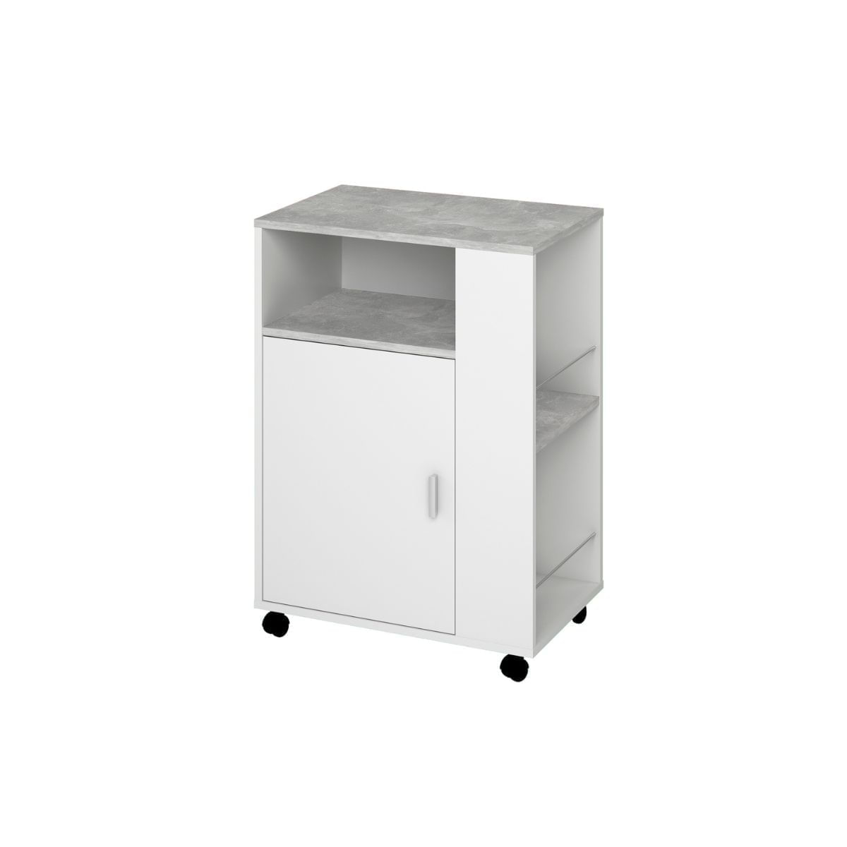 El carrito auxiliar Lyon es el complemento perfecto para tener tu cocina bien organizada y con todo a mano. Diseñado pensando en la funcionalidad y el espacio, este mueble compacto está fabricado en melamina de alta calidad y acabado en blanco con detalles en gris cemento, una combinación moderna que queda genial en cualquier cocina actual. Cuenta con una puerta abatible que esconde un compartimento cerrado ideal para guardar pequeños electrodomésticos, vajilla o utensilios. Además, tiene un compartimento abierto frontal y dos estantes laterales perfectos para colocar botes, especias o lo que uses a diario. Su tablero superior es amplio y resistente, pensado especialmente para colocar el microondas o cualquier otro aparato que necesites tener siempre a mano.