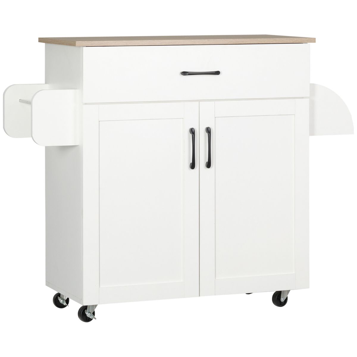 El carro de cocina con cajón, puertas y especiero es una excelente solución para añadir espacio y organización en cualquier rincón del hogar. Este carrito auxiliar incluye un cajón, un armario con estante ajustable en tres alturas, una barra lateral multifuncional que sirve tanto para colgar paños como de asa para desplazarlo, y un especiero integrado para mantener a mano tus condimentos favoritos. Su diseño con cuatro ruedas giratorias, dos con freno, facilita la movilidad y asegura estabilidad cuando está en uso fijo. Fabricado en melamina, su superficie es resistente y fácil de limpiar, lo que lo convierte en una opción duradera y práctica.