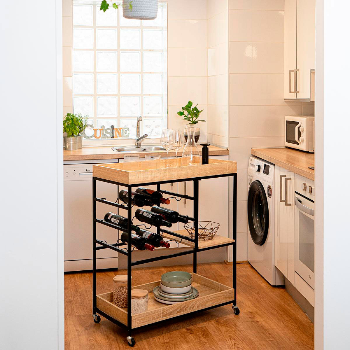¿Necesitas un lugar de almacenamiento elegante y versátil para tu cocina? ¡El carrito multiusos MOA de Vinthera es todo lo que buscas! El carrito MOA está construido con acero resistente y estantes de madera MDF de primera calidad. Esta combinación de materiales garantiza durabilidad a la vez que una estética cautivadora. El modelo MOA se compone de 3 estantes espaciosos (1 en la parte superior, 1 en el lateral y 1 como repisa inferior), lo que te da la capacidad de organizar y exhibir tus objetos de valor de manera impecable. Además, cuenta con 12 huecos botelleros que te permiten almacenar tus vinos favoritos. Gracias a las 4 ruedas giratorias, el carrito MOA es fácilmente transportable. Estamos ante un mueble auxiliar que es ideal para almacenar alimentos, vinos y una amplia variedad de objetos como copas, vasos o vajilla. Su versatilidad es lo que lo hace destacar, ya que se adapta a tus necesidades. ¡No esperes más! Introduce en tu cocina el carrito multiusos MOA de la marca Vinthera y disfruta de todas sus ventajas.