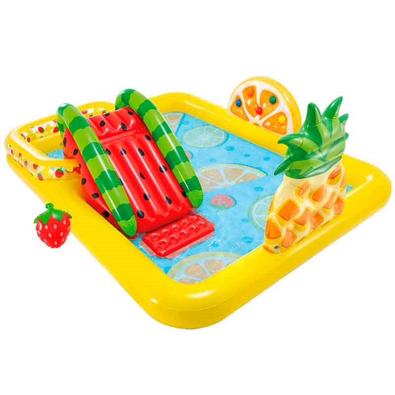 Tus niños se lo pasarán en grande jugando y disfrutando del verano con el centro de juegos acuático de la marca Intex. Está fabricado en PVC de alta calidad cuenta con 11 cámaras de aire. La piscina tiene una capacidad de 57 a 493L y soporta un peso de hasta 81kg. Incluye tobogán con suelo acolchado, 6 bolas de colores, 3 frutas hinchables, 1 aspersor con toma de manguera y 1 válvula para regular el flujo del agua. Está recomendado para niños mayores de 2 años y viene con tapón de desagüe y parche de reparación para posibles fugas o pequeños pinchazos.