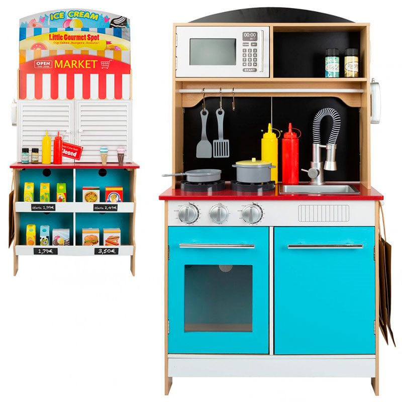 ¡Diviértete sin límites con esta cocinita 4 en 1 de la marca Woomax! Se trata de un gran juguete de madera con dos partes bien diferenciadas. Por un lado, se encuentra la cocina fija con electrodomésticos, fogones, fregadero y zonas de almacenaje. Por otro lado, vemos la parte que se intercambia para poder transformarla en heladería, hamburguesería y supermercado. Es muy fácil de intercambiar los lugares, por lo que podrás imaginarte historias y jugar con tus amigos adaptando el juego a cada emplazamiento. Además, incluye 25 accesorios para poder jugar con todos los escenarios. A tus hijos les encantará esta fantástica cocina 4 en 1 de Woomax. Consíguela ahora a un precio de chollo en Embargosalobestia.