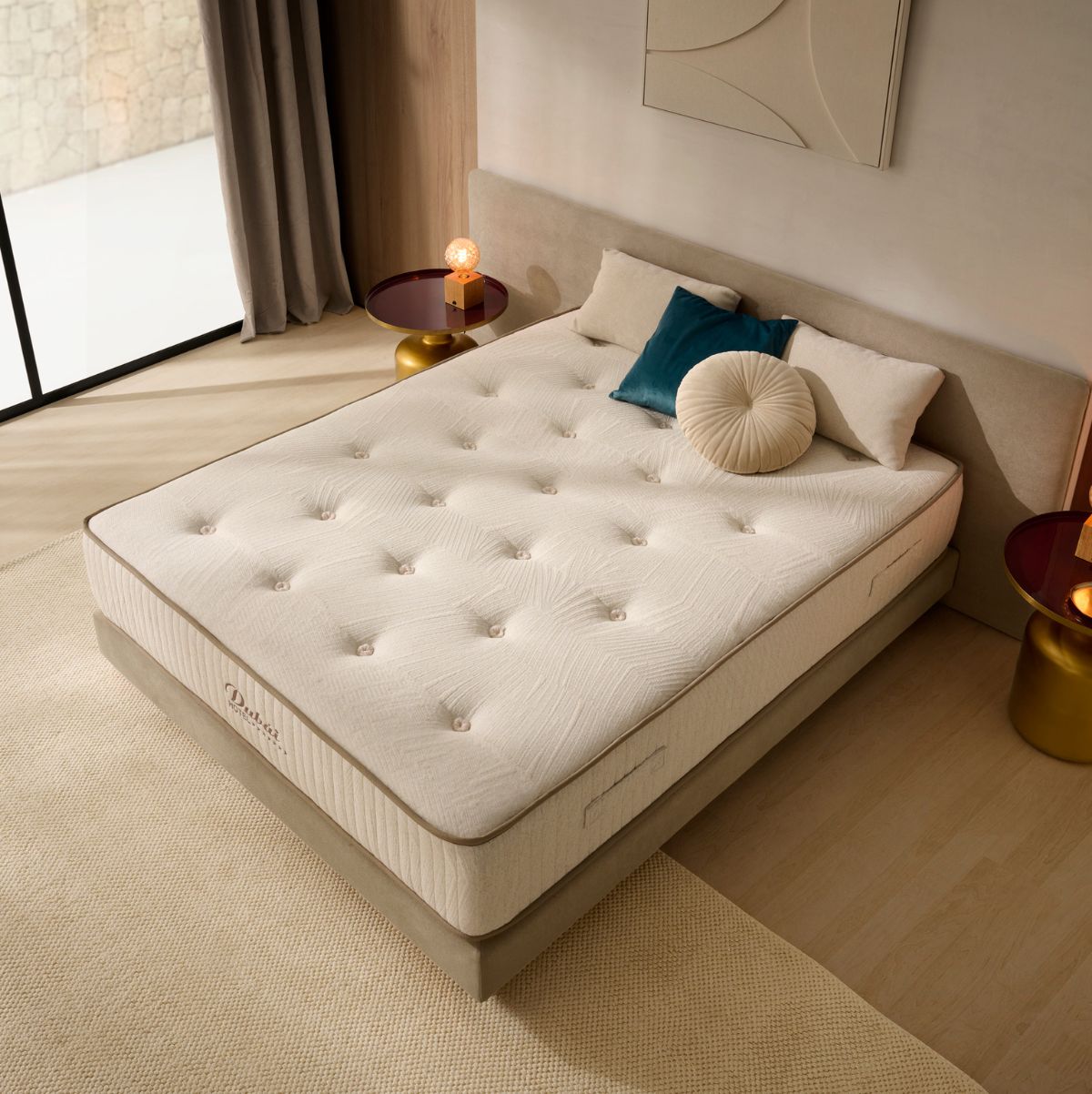 El núcleo está compuesto por muelles ensacados independientes y una doble capa de viscoelástica con grafeno en ambas caras, lo que garantiza una excelente adaptabilidad al cuerpo, favorece la regulación térmica y mejora la ventilación del colchón. Su platabanda está confeccionada en lino natural, con costuras reforzadas y un logotipo bordado a mano con gran delicadeza. Además, el punzonado artesanal incluye detalles únicos con borlas de algodón natural que aportan un acabado firme y duradero. Tiene un nivel de firmeza media-baja, una altura de 30 cm y una total independencia de lechos, lo que evita que los movimientos de una persona afecten al descanso de la otra. El tratamiento higiénico Sanitized protege el colchón frente a ácaros, bacterias y hongos, manteniéndolo limpio y en óptimas condiciones durante más tiempo. Fabricado en España, el colchón Dubai 7 Estrellas es una apuesta segura para mejorar la calidad de tu sueño. Adaptabilidad, frescor y tradición se combinan en este modelo para ofrecerte un descanso de primera.