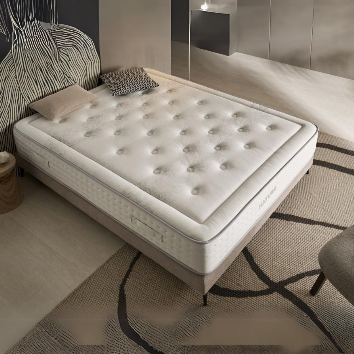 ¿Pensando en renovar tu colchón? El colchón Artesanal Vip Nature, es un seguro de descanso que combina tecnología con artesanía. Con un núcleo de inyección de viscoelástica Nature y su soporte flexible, este colchón ofrece un soporte personalizado y una distribución uniforme del peso corporal para un sueño reparador. El acabado en tejido Jacquard y el lateral ultrasuave Velour con asas no solo añaden un toque premium, sino que también garantizan durabilidad y facilidad de manejo. El acolchado en ambas caras, con 7 cm de visco de inyección Nature + supersoft y fibras naturales y regulador térmico que proporciona una sensación de ingravidez al cuerpo, mientras que el diseño de formas geométricas sin espacios ni saltos entre las costuras crea una superficie suave y uniforme. Gracias al sistema Nature, experimentarás un efecto nube al recostarte, mientras que las 11 zonas de descanso sin puntos de presión aseguran un confort óptimo en cada parte del cuerpo, además, se le incorpora cámaras de aire independientes con las que la salida del aire será constante aportando un aislamiento térmico. Con una firmeza media-alta, ¡este colchón ofrece el equilibrio perfecto entre soporte y comodidad! El flujo de aire constante garantiza una temperatura ideal durante toda la noche, mientras que la función higiénica Sanitized y las propiedades antimicrobianas mantienen el colchón fresco y libre de alérgenos. ¡Dale a tu descanso la importancia que merece con el colchón Artesanal Vip Nature!