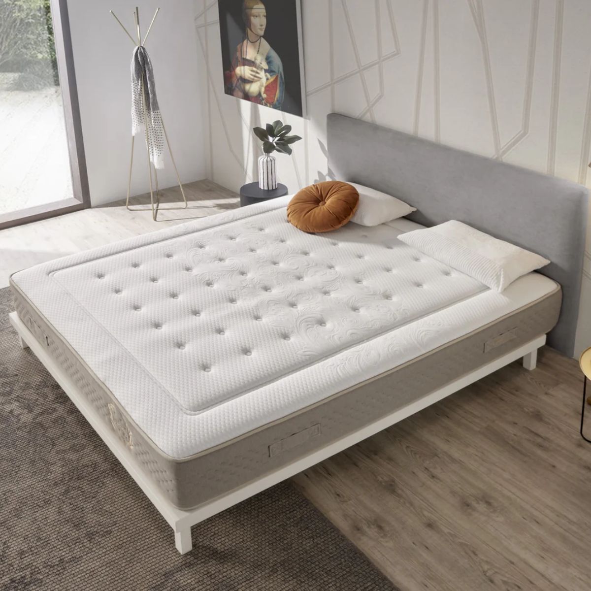 La platabanda del Privilege está revestida con un tejido stretch acolchado y un bordado frontal de alta gama. Su acolchado en ultrasonidos de última generación, junto con las asas en los laterales y frontal, refuerza su durabilidad y facilita su manejo. Cada tapa está acolchada de manera individual para asegurar que el dibujo quede perfectamente centrado y las costuras sean más profundas, optimizando la distribución de presiones y el volumen del colchón. La cara inferior del colchón está equipada con un tejido 3D de máxima transpiración, fibra natural y micro canales de ventilación para prevenir la acumulación de humedad y sudoración. Su ribete, con cosido especial de seguridad, asegura una mejor compactibilidad. Además, el Privilege incluye tratamientos avanzados como el Sanitized® para una protección antimicrobiana duradera, manteniendo el colchón libre de moho, ácaros y algas. Su estructura silenciosa y la independencia de lechos mejoran la calidad del sueño, mientras que la correcta alineación de la columna está garantizada. Todos los tejidos cumplen con la normativa OEKO-TEX® Standard 100, asegurando que el colchón es libre de sustancias nocivas.
